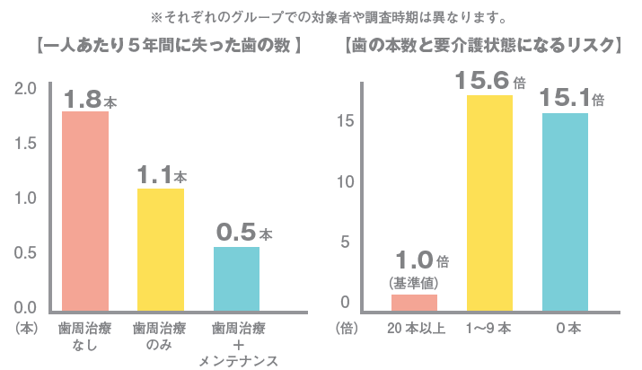 メンテナンスを受けている方と受けていない方では失ってしまう歯の数が圧倒的に違ってきます。